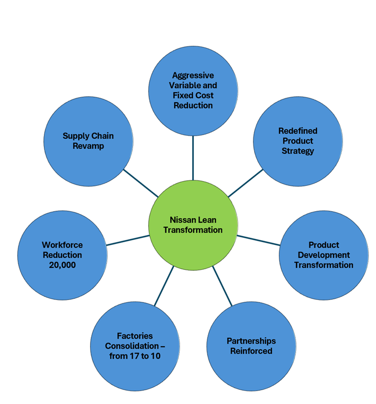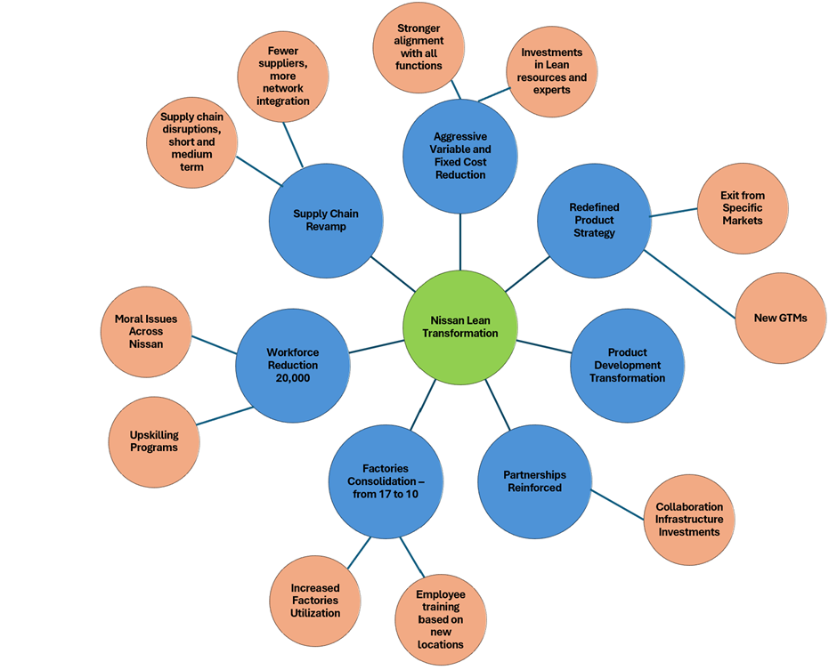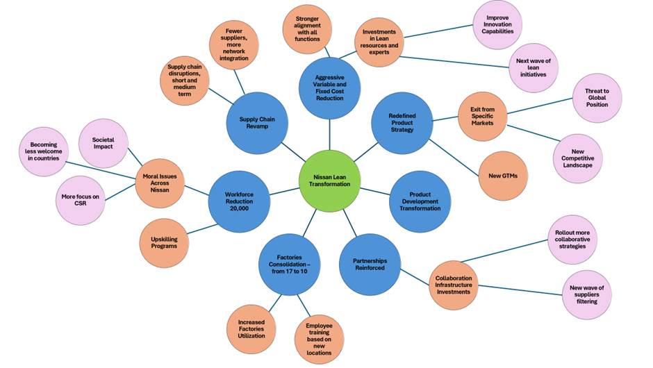 This can be represented through the seven main pillars announced by Nissan. To enable the Lean Transformation, the seven circles across the first order ring will be the first set of consequences. For example, to achieve the cost reduction targets, the company will need to reduce the workforce by 20,000, consolidate factories, shut down some operations and apply an aggressive approach to slashing variable and cost fixed costs. From another perspective, to ensure a leaner implementation, process will need revamping — this applies to product development and supply chain.