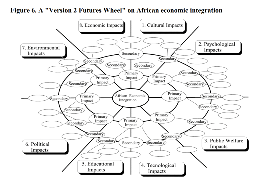 Developed by Jerome Glenn in 1971, the Futures Wheel is a brainstorming and visual mapping tool. Its objective is to explore probable / plausible consequences of a momentous change coming up in the future. Its design allows a systematic and expansive thinking of the first, second and third order effects of that future change or transformation. The figure below is extracted from later research by Jerome Glenn showing how this tool can be used to explore African Economic Integration consequences.